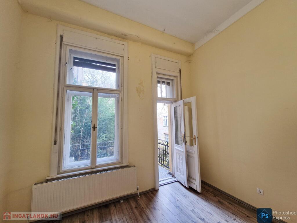 A több,mint 100 éves ház fel van újítva,és csodálatos belső kerttel rendelkezik. Az két lakás egybenyitásával kialakított ingatlan első emeleten található,körfolyosósóról megközelíthető. A kétszárnyú bejárati ajtó tágas előtérbe vezet,és az egész lakást a nagyvonalú ,tágas terek jellemzik.