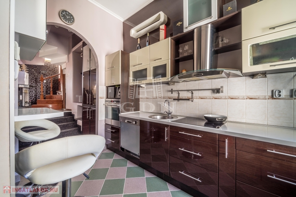 A 106 négyzetméteres lakás az 5. emeleten helyezkedik el, belső kétszintes, kandallóval, és két szaunával is felszerelt.