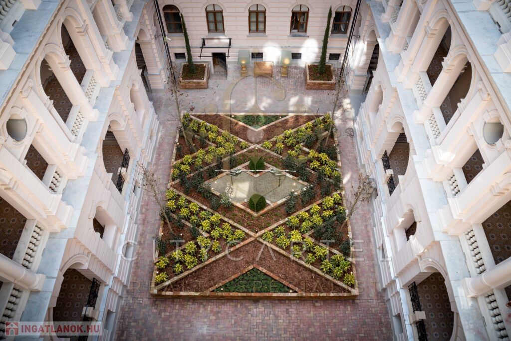 A külső díszudvar szökőkúttal és díszfákkal kialakított, az épületen belül négy különleges udvarral rendelkezik az épület:
