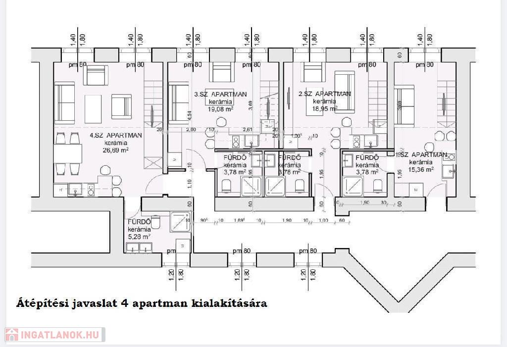 Budapesten a VI. kerületben a Bajcsy Zsilinszky úton eladó egy 121 nm-es 4 szobás lakás, ami adottságaiból adódóan jól átalakítható egy 4 lakásos apartmanná, ahol minden lakrész külön nyílik, van külön fürdő és kis teakonyha a lakásokhoz (lásd átépítési alaprajz).