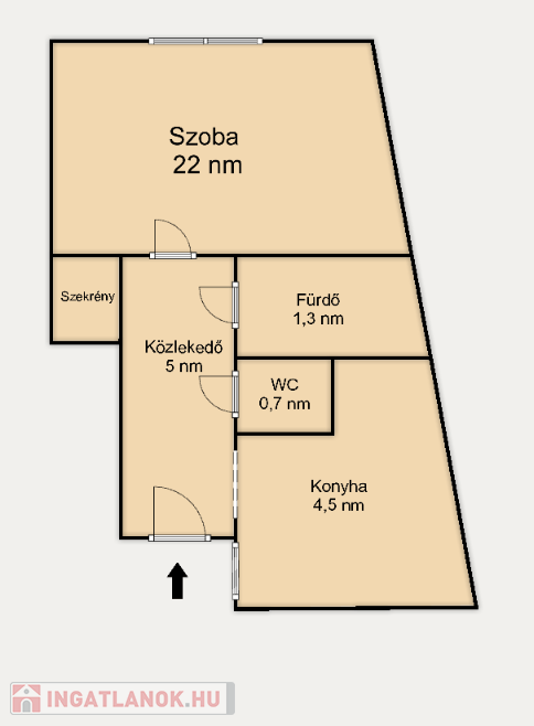 A lakás kiváló elosztású és jól kihasználható terekkel rendelkezik. A 22 m²-es nappali tágas, akár hálórésszel is leválasztható. Az ingatlan része egy nagy előszoba beépített szekrénnyel, egy ablakos konyha spejzzal, egy kádas fürdőszoba, valamint egy külön helyiségben található WC.