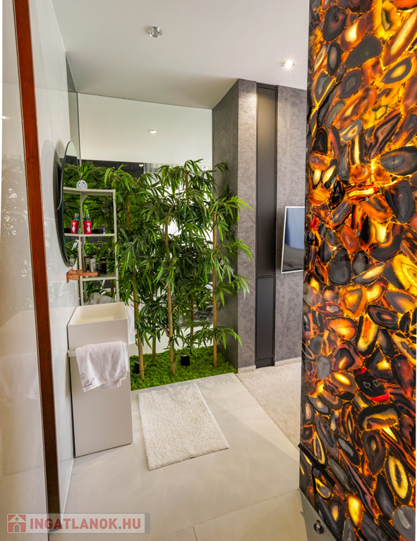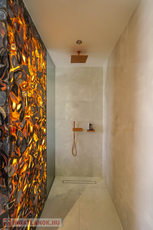 - Különleges onyx térelválasztó a hálószoba és a fürdő között.