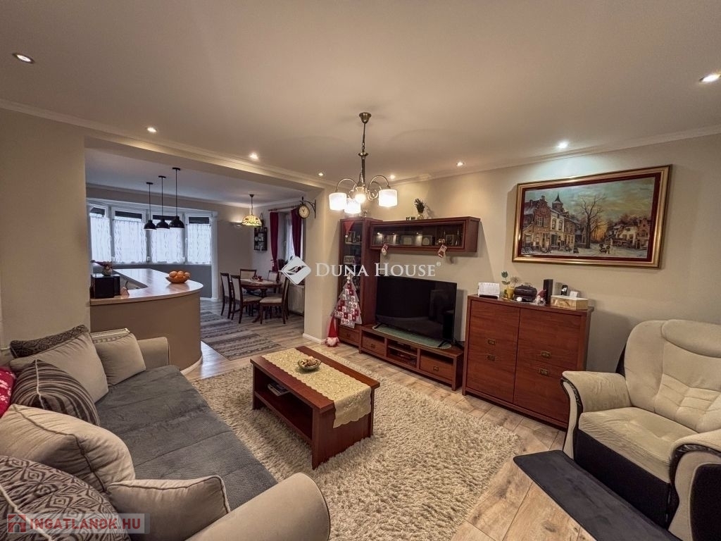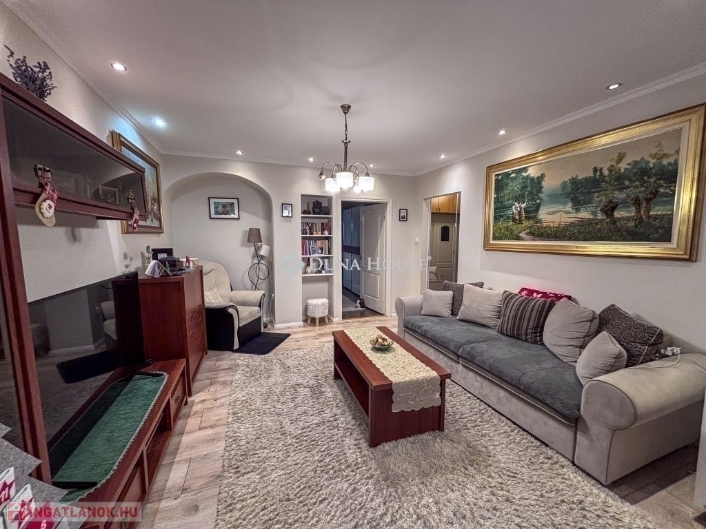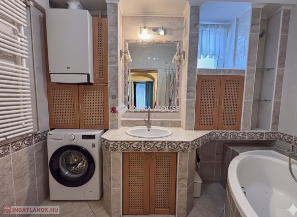 Az ingatlan 5 évvel ezelőtt teljes körű felújításon esett át, így tisztasági festés után azonnal költözhető állapotban van. A lakás elosztása kiváló, két különnyíló szobával rendelkezik, amelyek 21 és 15 nm alapterületűek, valamint egy tágas, világos, 44 nm-es nappali-konyha-étkező alkotja az életteret. Továbbá tartozik hozzá egy 100 nm-es saját használatú kertrész faházzal, egy galériás garázs, saját parkolóhely közvetlenül a ház mellett, két pince, egy nagyobb, körülbelül 15 nm-es és egy kisebb, 5 nm-es.