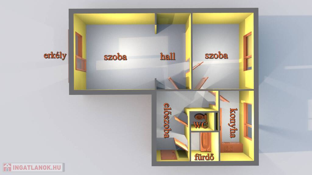Az 55 m2 elrendezése: előszoba , fürdőszoba káddal, külön WC, konyha, két külön bejáratú szoba + hall.