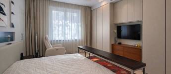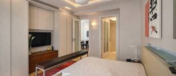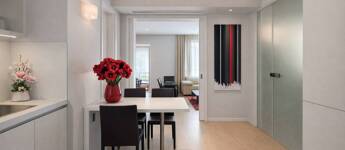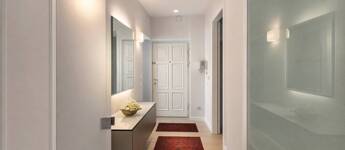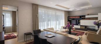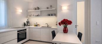A lakás kiváló arányú, tágas terekkel rendelkezik, magas belmagassággal és mennyezetig épített tárolórendszerekkel.