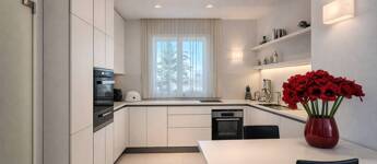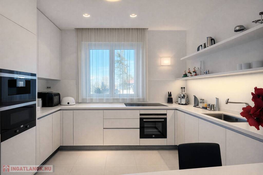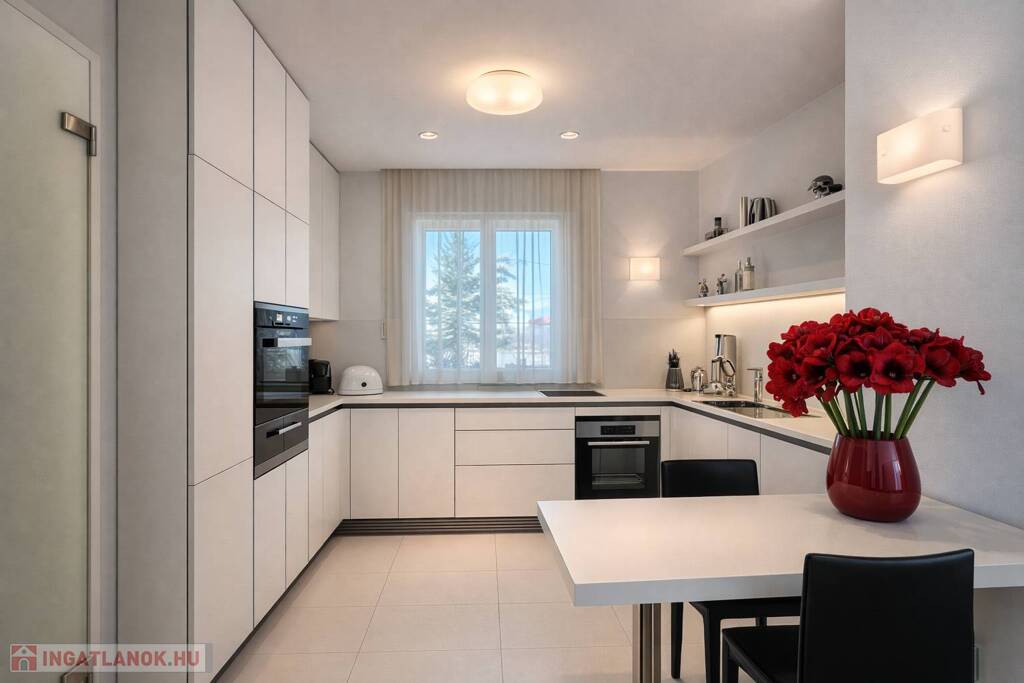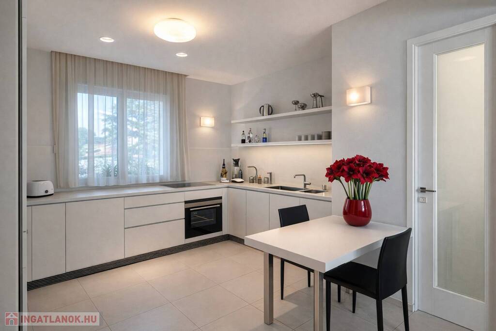 A napfény végigsimít a magasfényű felületeken, a tér pedig egyszerre letisztult, elegáns és megnyugtató – pontosan az az érzés, ami miatt ezt a lakást látni kell.