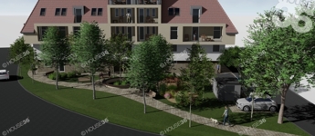 A társasház első emeletén, 46,37 m2 lakóterű, nappali + amerikai/konyhás lakás, 5,64 m2 erkéllyel megvásárolható.