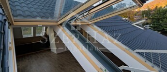 A tágas, amerikai konyhás nappali különlegessége a teljesen kinyitható tetőtéri ablakok, melyek kis erkélyként is használhatók, így közvetlen kapcsolatot teremt a természetes környezettel.
