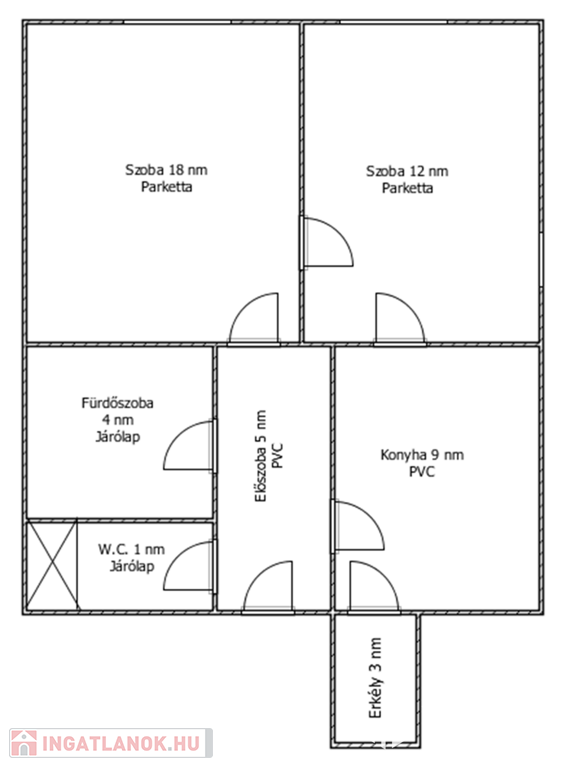 Helyiségei: 2 szoba, konyha, előszoba, fürdőszoba, külön nyíló W.C., erkély.