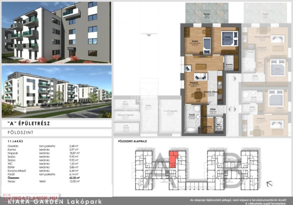 Szombathely zöldövezeti, dinamikusan fejlődő városrészén, energiahatékony, modern lakások várják új tulajdonosaikat. Kiara Garden lakóparkban kettő ütemben épülő , minden igényt kielégítő lakásai nappali+1 szobával, nappali+2 szobával, nappali+ 3 szobával fognak rendelkezni. Az ingatlanokhoz nagy erkélyek teraszok is tartoznak. A legnagyobb lakás dupla komfortos kialakítású lesz. Egyedülállóktól a nagy családosokig megfelelő otthona lehet bárkinek. A belváros közeli ingatlanok lehetőséget biztosítanak egyedi belső kialakításokra. A lakás gazdaságos fűtéséről és melegvíz ellátásáról távhő szolgáltató gondoskodik. A fűtésrendszer egyedileg szabályozható, saját hőmennyiség mérővel ellátott. A hőleadás padlófűtésen keresztül történik. Az ingatlanok ideális hőmérsékletét, a nappaliban elhelyezett split klíma biztosítja. Az épületben kellő számú zárható tároló kerül kialakításra, külön bejárattal. ( 2.96 m2-es tároló 1 790 000 Ft ) Természetesen vannak nagyobb tárolók is. A lakótömbök udvarán található felszíni parkolók ára 1 490 000 Ft. Bővebb tájékoztatásért kérem vegye fel velem a kapcsolatot.