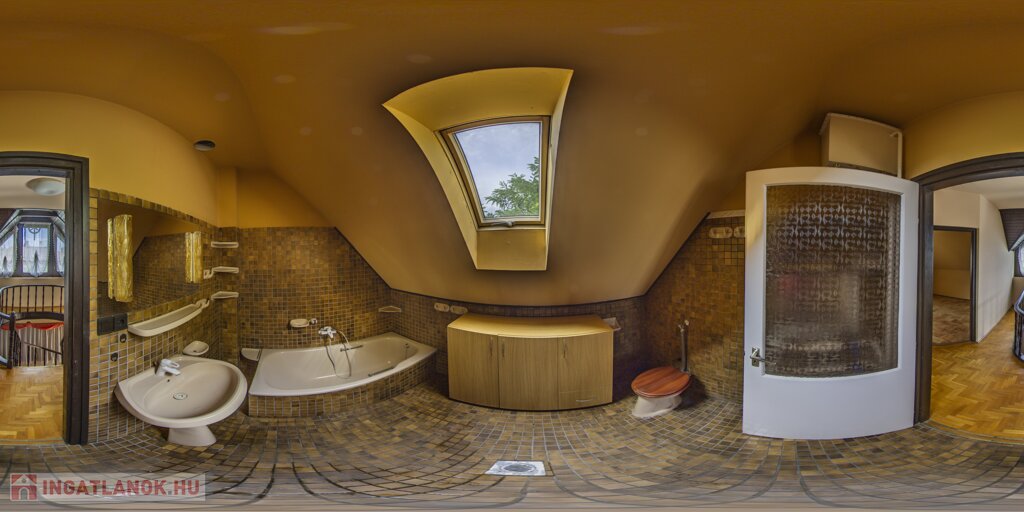 A földszinti fürdőszoba zuhanyzós, az emeleti pedig kádas. A földszinti és az alagsori illemhely különálló, az emeleti a fürdő része. B tarifájú áram ellátás is elérhető a bojler stb. működtetéséhez.