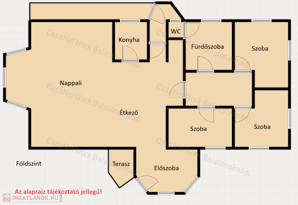 - földszint: tágas nappali-étkező, konyha, előszoba, három hálószoba, fürdőszoba, toalett és terasz