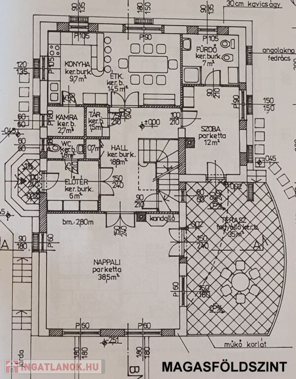 * Magasföldszint 113 + 35 m2: nappali (39 m2), konyha-étkező, szoba (12 m2), fürdő, kamra, tároló, WC, hall, előtér, terasz (35 m2)