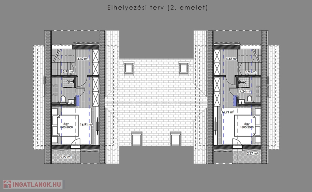 A tulajdonos ajándékba adja továbbá a tetőtéri szülői háló teljes bútorzatát, melyet a belsőépítészeti tervek alapján méretre gyártanak le.