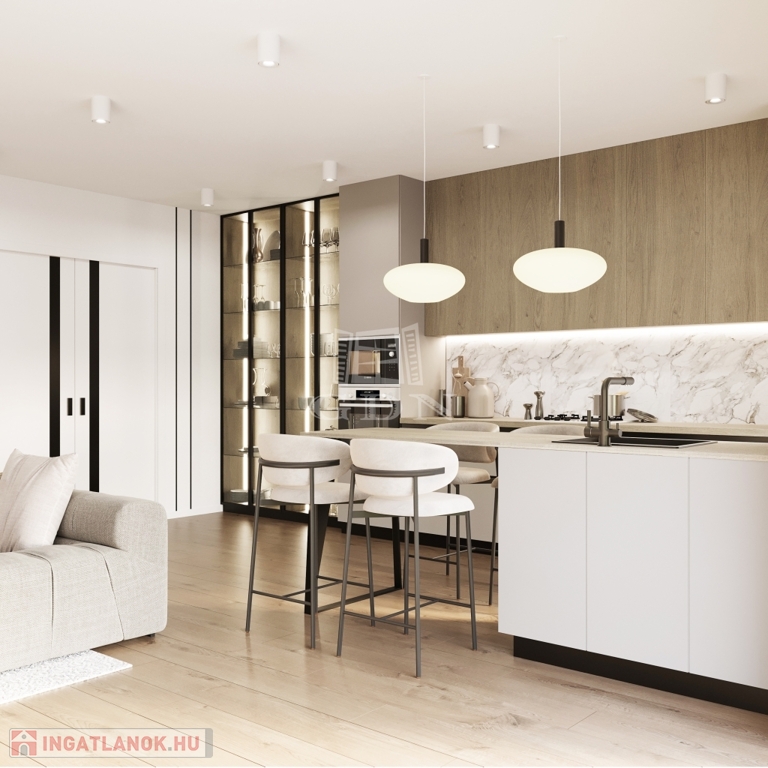 A lakás felszereltségéhez tartozik a teljes konyhabútor Bosch berendezésekkel, ebédlőszigettel, valamint a nappali polcrendszere a belsőépítészeti terveknek megfelelően.