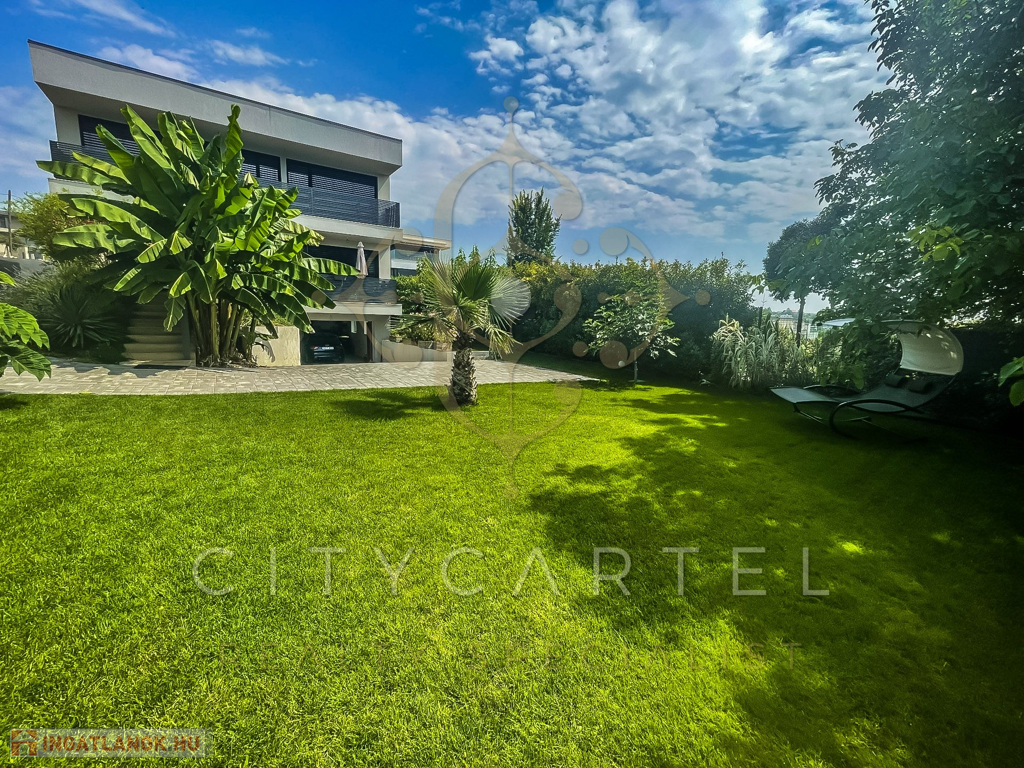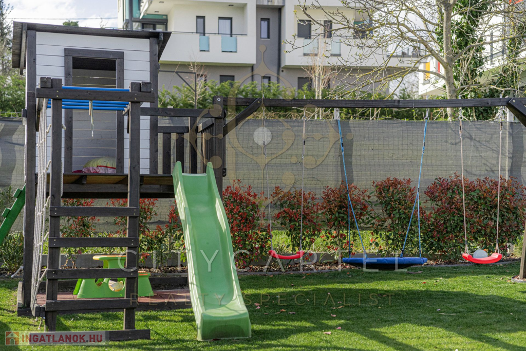 A gyönyörűen gondozott kertben 2 éve épült, karbantartott játszótér, gyümölcsfák, egzotikus növények és automata öntözőrendszer található, külön kerti vízmérővel.