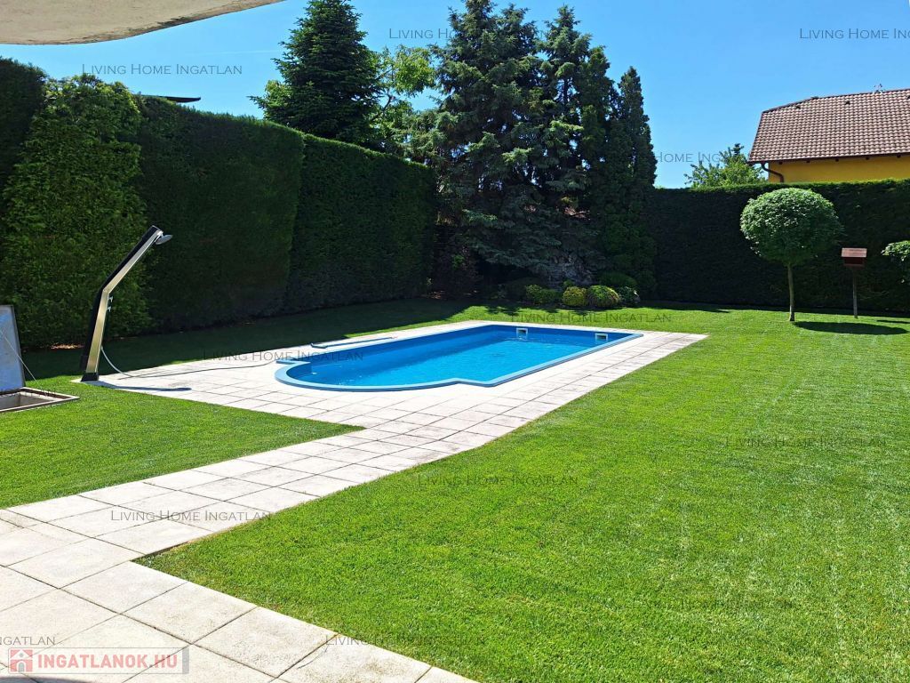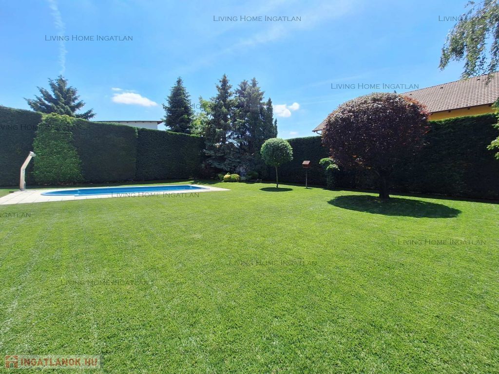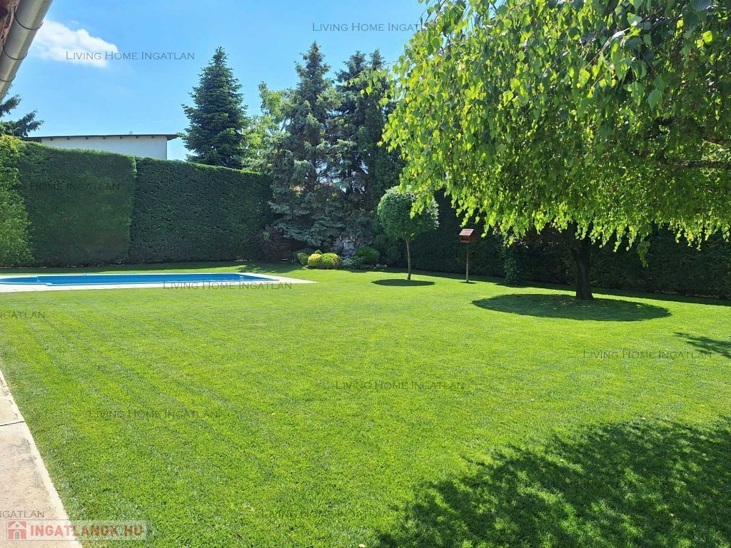 A kertje kertész által gondozott, parkosított, füvesített (automata öntözőrendszer, mely saját kútról működik), örökzöldek, fák, rózsák teszik csodálatossá. A kerítések mentén a magasra nőtt, szépen nyírt sövények biztosítják a szomszédoktól és az utcáról a lakók számára a teljes intimitást. A kert egyik sarkában egy mesterséges nagyméretű csobogó-vízesés látványát és hangját élvezhetjük. A kerti medence mérete 8x4 m és 1,5 m mély, mely fűthető is.