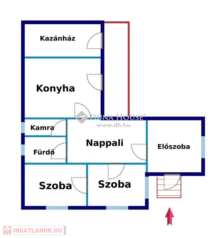 Kialakítása: nappali, 2 szoba, tágas előtér, fürdő+wc, kamra, konyha, kazánház.