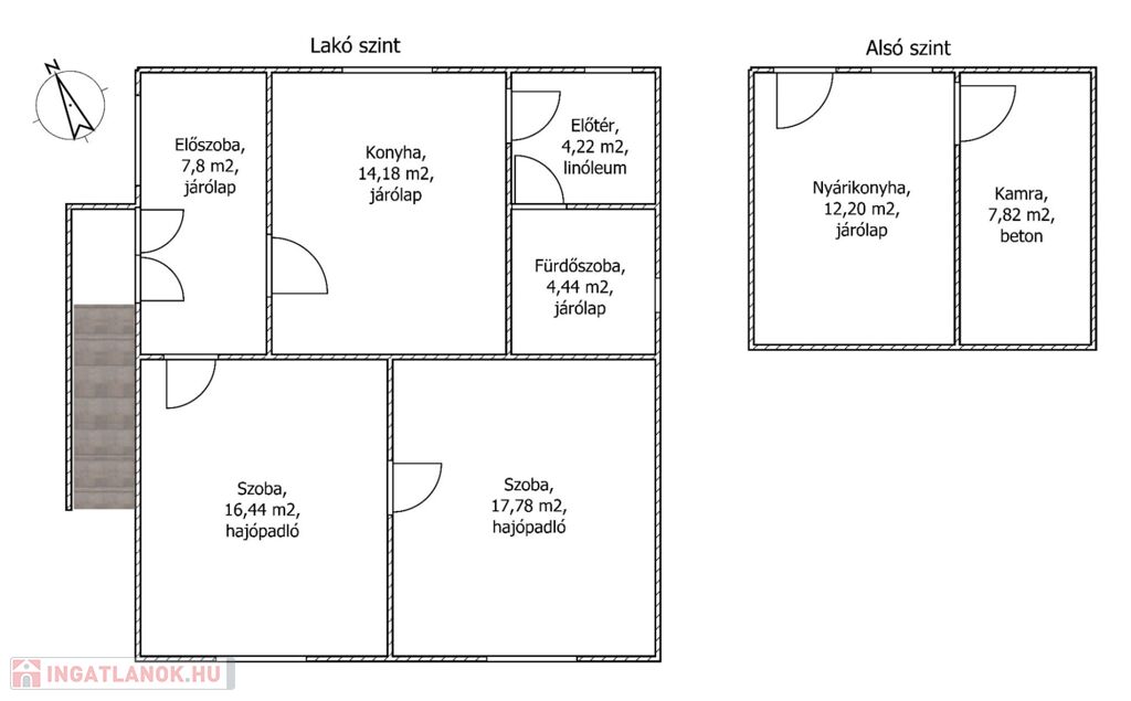 A felső szinten, előszoba, két nagy lakószoba, konyha, fürdőszoba van, az alsó szinten nyári konyha, és egy nagy tároló helyiség található, valamint egy kisebb melléképület.