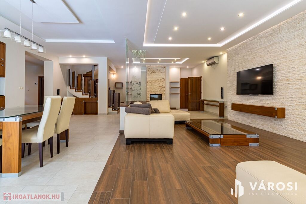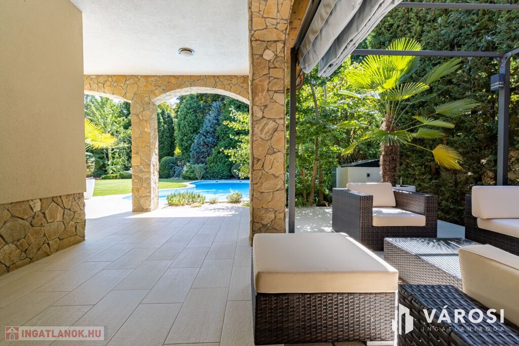 Gyönyörűen parkosított 1163 m2-es kertben, 426 m2 össz alapterületű, medencével, dupla garázzsal, kerti társasági sarokkal, nagy teraszokkal rendelkező, hatalmas belső terekkel, klimatizálva, padlófűtéssel, a képeken látható teljes berendezéssel, igényes kivitelezéssel épült mediterrán típusú ingatlan várja új tulajdonosát.