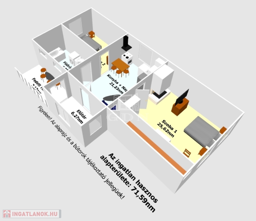 Az épület hasznos alapterülete 71,59nm melyben található: