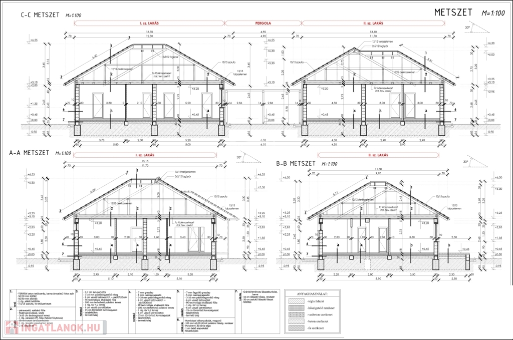 A tartószerkezeti falak 30-as porotherm téglából készültek, a padlón 10cm lépésálló szigeteléssel, a homlokzatokon 10cm-es eps szigeteléssel, a vízszintes födémen 30 cm ásványgyapot szigeteléssel. A külső nyílászárók korszerű 6 légkamrás, 3 rétegű üvegekkel szereltek.