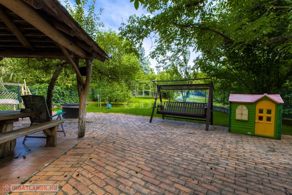 Ingatlan környezete tiszta rendezett, növények gondozásáért öntöző rendszer felel. A telek végében található még egy mini tanyavilág, kerti kiüllővel, sütögetővel, kemencével, tárolókkal, mögötte pedig a Szilas patak csörgedezik, melyhez saját lejáron keresztül juthatunk le.