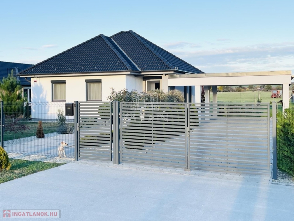 A teljesen sík, gondozott, bekerített telek biztonságos és kellemes környezetet biztosít, ahol a tágas terasz, a fedett kocsibeálló és az esztétikus tároló is a kényelmet szolgálja.