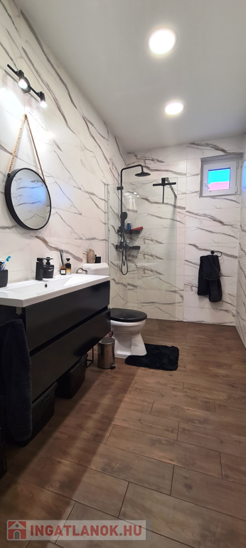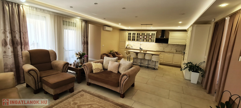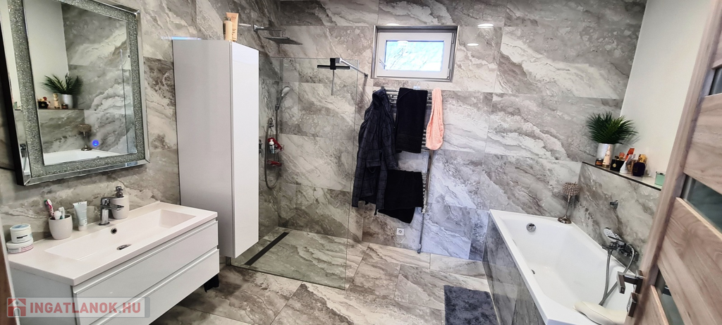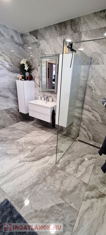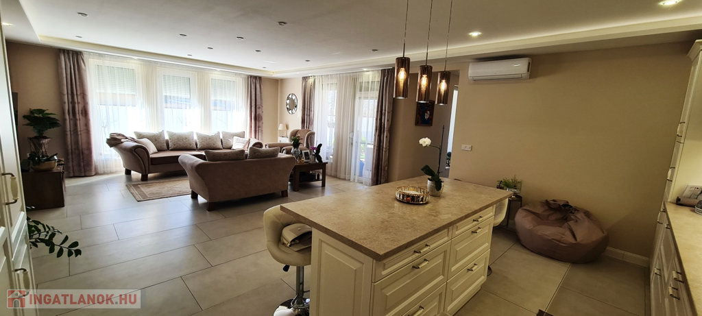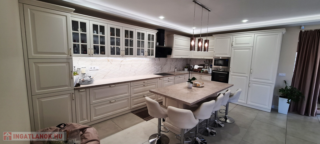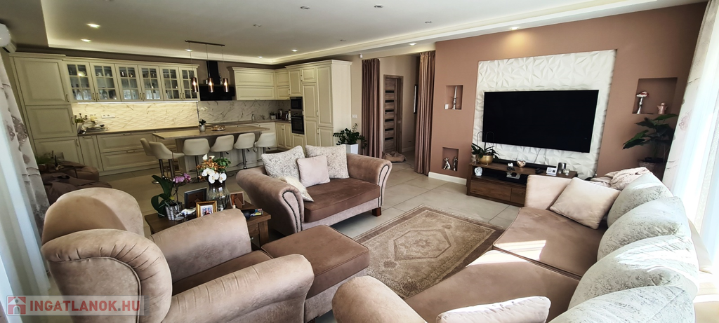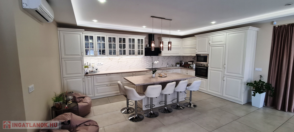 A családiház fűtését kondenzációs gázkazán biztosítja padlófűtéssel, hűtéséről pedig klímaberendezés gondoskodnak. Az egyedi készítésű konyhabútor energiatakarékos háztartási gépekkel felszerelt, és nagy tárolási felületet biztosít. Az ingatlan szép napfényes szobái külön nyílnak, a magas minőségű burkolatokkal és szaniterekkel felszerelt modern fürdőszobák mellett még egy mosókonyha teszi komfortossá az ingatlant. A családi ház értékét növeli a nappalihoz kapcsolódó nagy fedett terasz, a 22nm-es elektromos kapuval felszerelt garázs, a kamerákkal összekötött riasztórendszer, a kamerás kaputelefon, és a mozgásérzékelővel ellátott kültéri világítás. Ha egy magas minőségű és modern családi házat szeretne ez egy jó lehetőség lehet az ön számára.