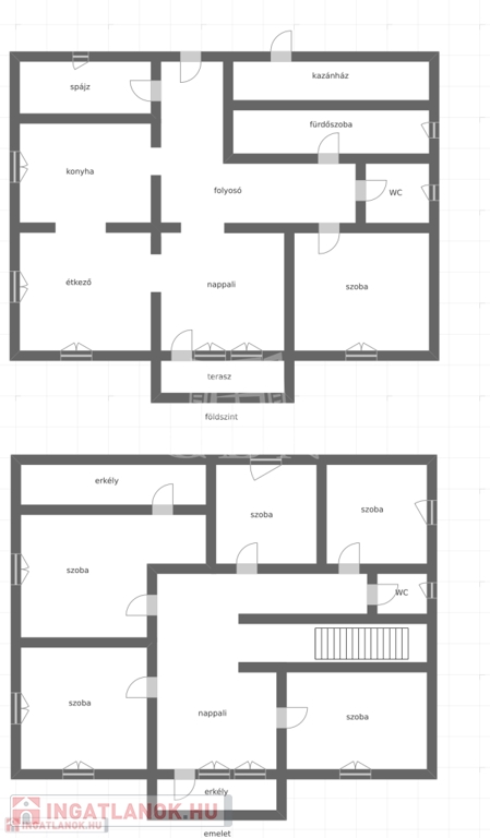 - emelet: nappali, négy hálószoba, az ötödik hálószoba igény szerint fürdőszobává is alakítható (a vízbekötés előkészítése megtörtént), illemhely.