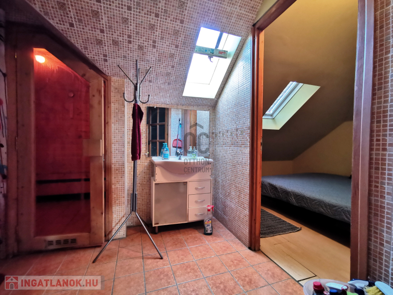 Az emeleten további tágas nappali (jelenleg klubszoba és konditerem), egy hálószoba, fürdőszoba és szauna kapott helyet, így a ház tökéletes a teljes kikapcsolódáshoz, akár két generáció számára is.