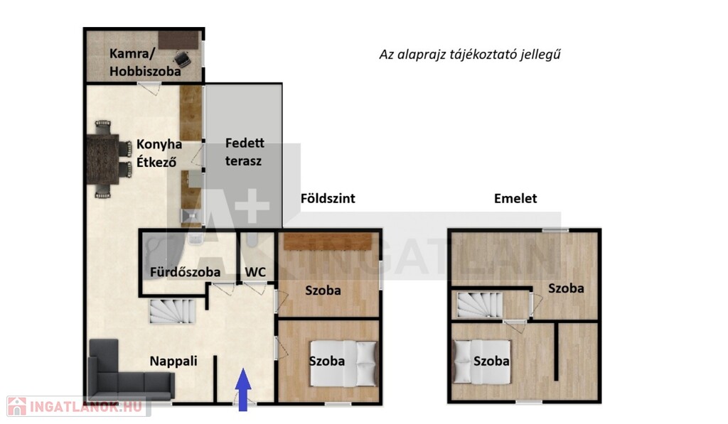 - 2 külön bejáratú hálószoba az emeleti, hőszigetelt tetővel kialakított térben 1-1 gardróbbal