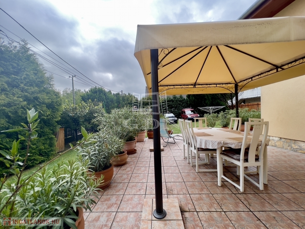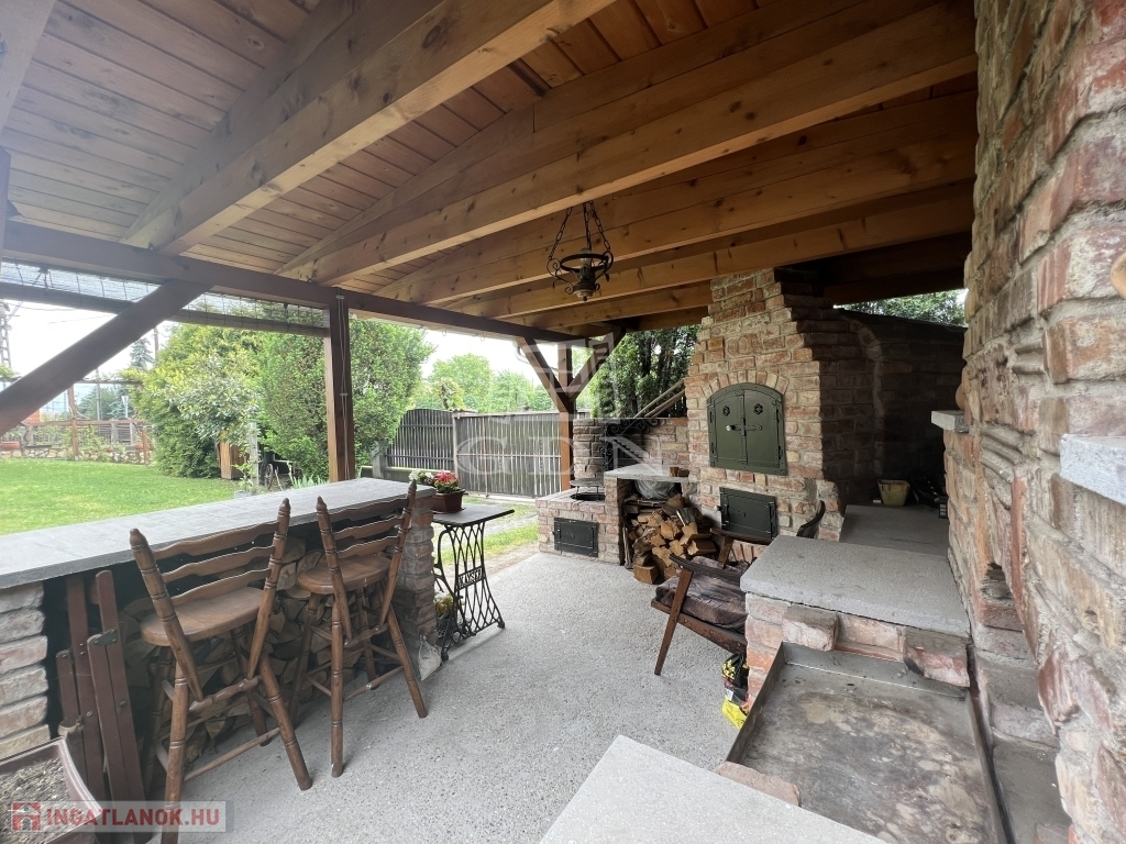 A kert gondozott, fedett kiülővel és kerti sütőhellyel, ideális helyszín a nyári estékhez. A házhoz tartozik terasz, garázs, valamint több autó számára parkolóhely az udvarban.