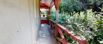 A másik bejárat hangulatát az örökzöldek és a dísznövények teszik kellemessé.