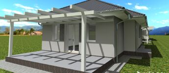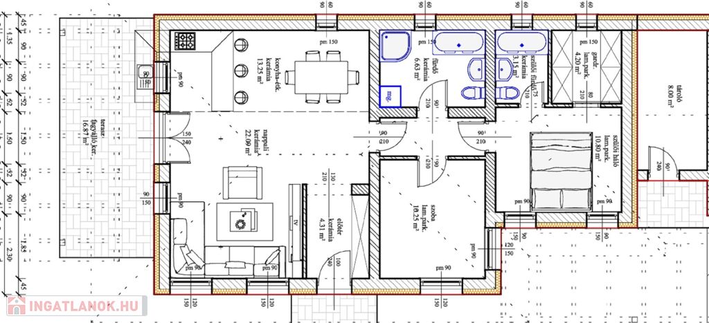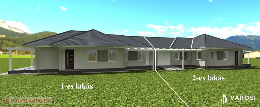 -bruttó 98nm-es ikerház( 2 lakószobával,2 fürdőszobával(duplakomfortos), tárolóval, közlekedővel és amerikai konyhás nappali(16nm-es fedett terasz, 8nm-es tároló és 75nm-es lakóingatlan