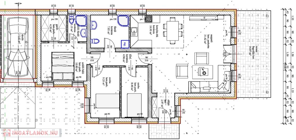 A 16nm-es fedett terasz, illetve a 12nm-es garázs mellett a lakóingatlan nettó 95nm-es nagysággal rendelkezik.