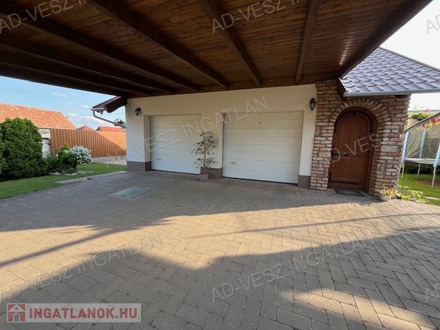-Garázs előtt 6x6 méteres féltetős, viakoloros autóbeálló.