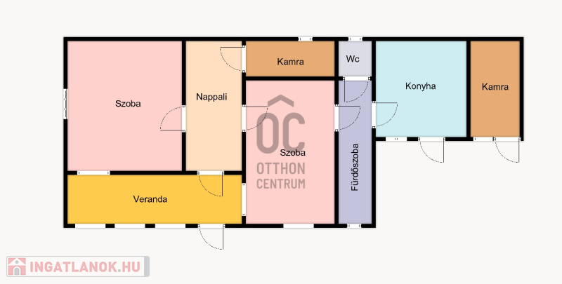 - 2 szoba, konyha, kamra, fürdőszoba, wc, veranda, nappali helyiségekből áll.