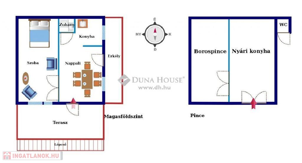 A pihenésre illetve a gazdasági épületnek használt két szint jól elkülönül. A magasföldszinten egy nagy szoba, nappali, konyha, zuhanyzó, erkély és terasz található, míg a pinceszinten borospince, nyárikonyha és WC került kialakításra. A felső szinten az étkező-nappalin keresztül jutunk el a nagy szobához, a zuhanyzóhoz, illetve a konyhához. Az erkélyről panorámás kilátás nyílik a környező erdőkre. Az épület azonnali használatra is alkalmas, de tetszés szerint felújítható, alakítható illetve a területnagyság további bővítésére is jelentős lehetőséget biztosít .A fűtés fatüzeléssel kis kályhával illetve két sparhelt segítségével biztosított. A zuhanyzó illetve a csapok meleg víz ellátása kis méretű kazán segítségével lett megoldva.. Az ingatlanba az áram és a víz be van vezetve, csatorna és gáz a térségben jelenleg nem elérhető. Vízgyűjtő ciszterna és melléképületek is találhatóak a területen.